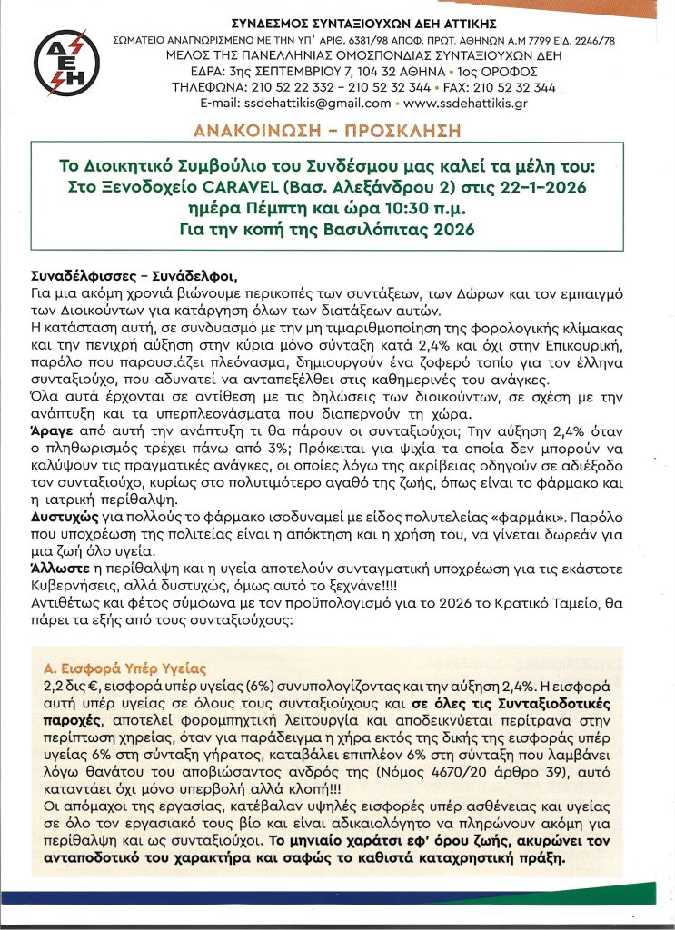 Υ.Γ.Σας υπενθυμίζουμε για την κοπή της πρωτοχρονιάτικης πίτας, στο Ξενοδοχείο CARAVEL (Βασ. Αλεξάνδρου 2) στις 22-1-2026 ημέρα Πέμπτη και ώρα 10:30 π.μ.
